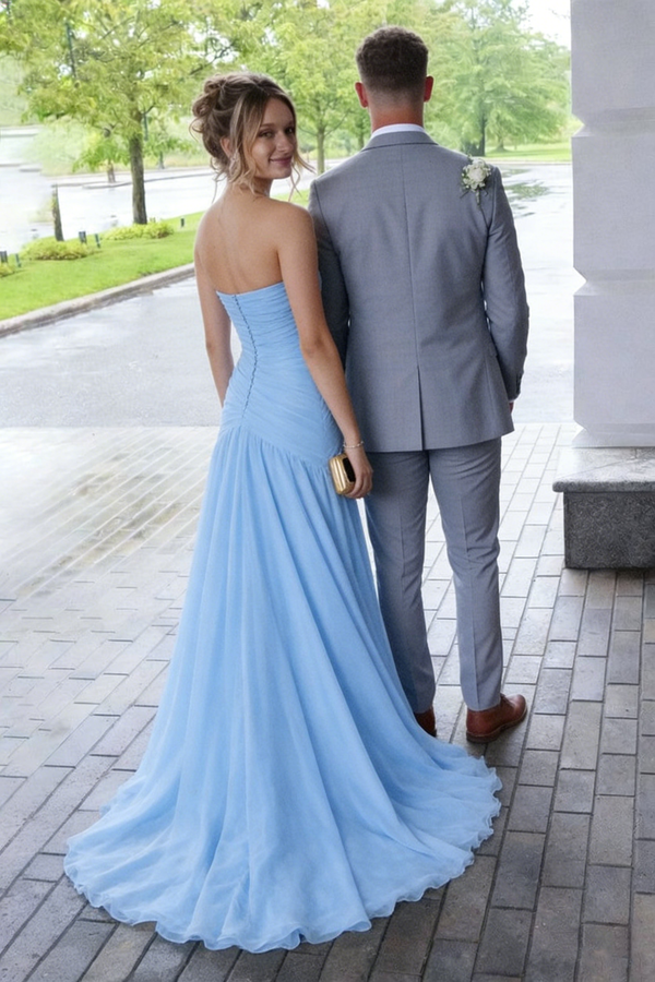 Chic Light Blue Strapless Chiffon Prom Dress Pleated A-Line Formal Dance Wear,OLP1851