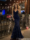 Classy Navy Blue Sequin Mermaid Prom Dress V-Neck Sleeveless Sparkly Evening Gown,OLP1928