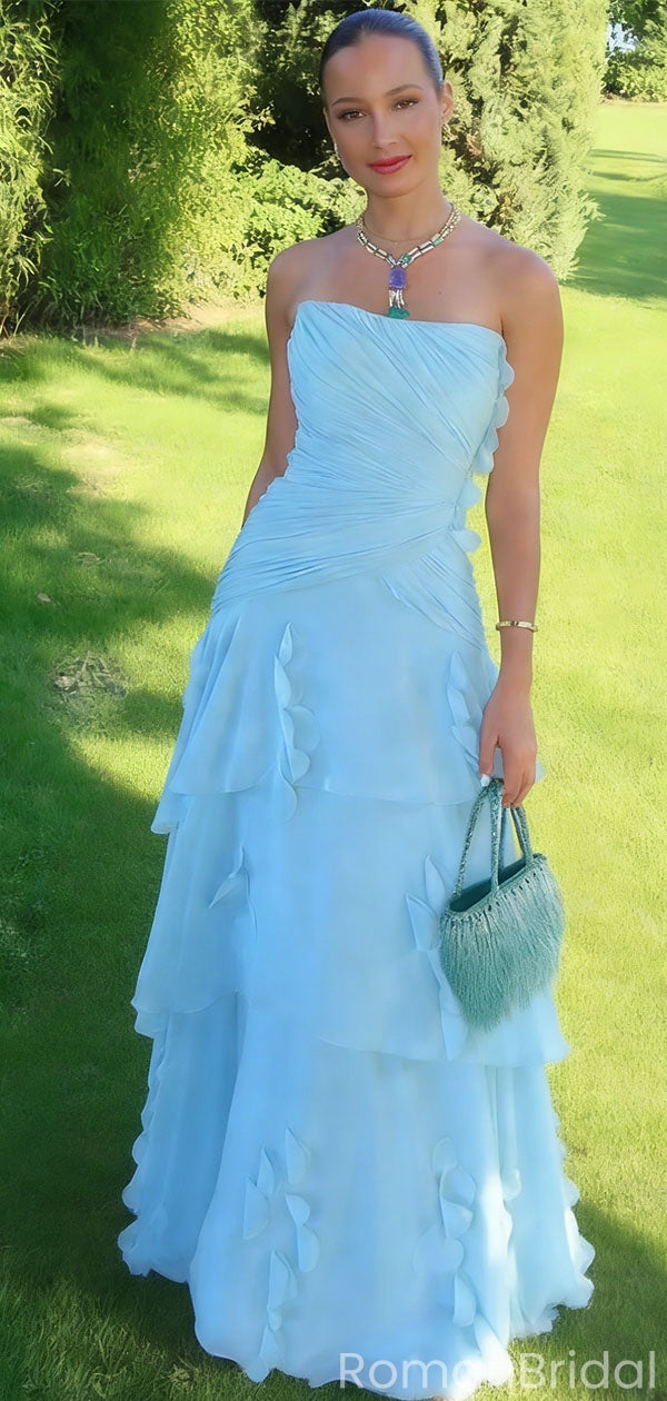 Classy Blue Strapless Ruched Chiffon Prom Dress Tiered Ruffle Formal Maxi Gown,OLP1844