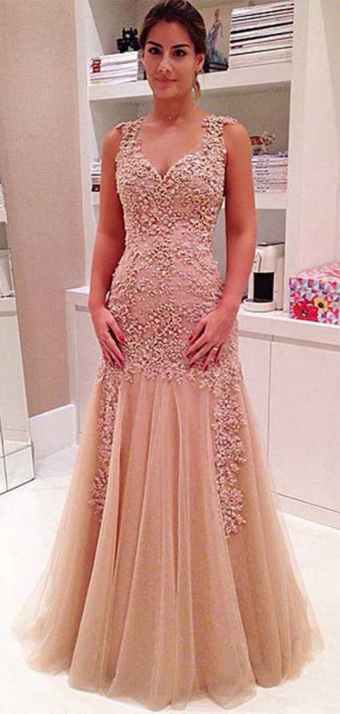 Elegant Spaghetti Strap Sleeveless A-line Lace Long Prom Dresses Online, OL473