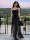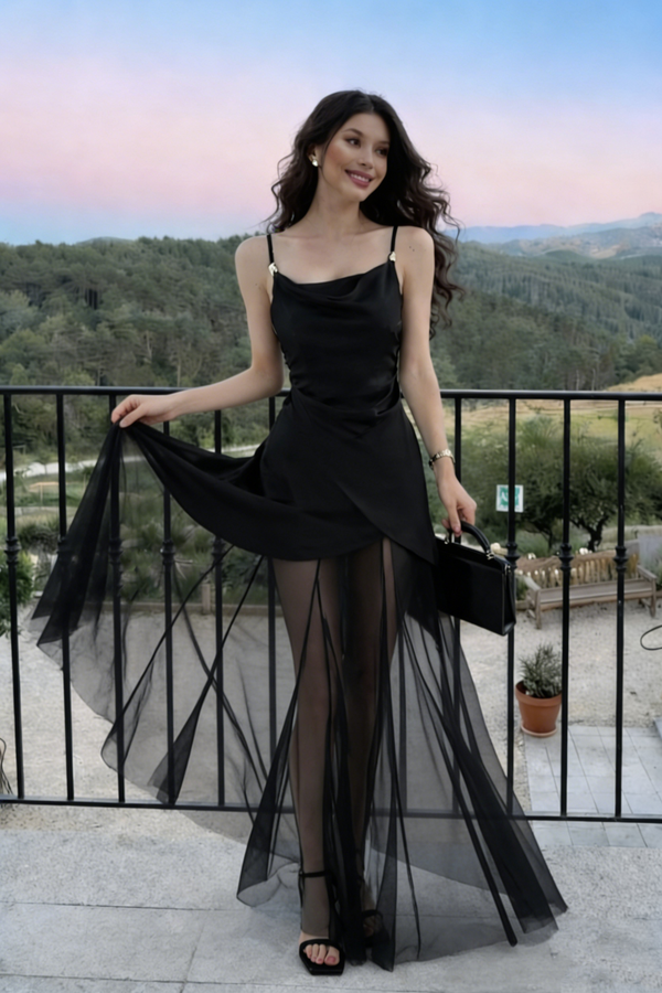 Sexy Cowl Neck Black Satin Prom Dress with Sheer Tulle A-Line Overlay Skirt,OLP2000