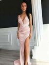 Elegant Pink V-Neck Mermaid Side Slit Long Prom Dress Ideas, Evening P