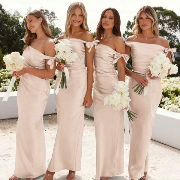 Modern Champagne Off the Shoulder Satin Bridesmaid Gown with Unique Side Tie Sleeves,BG935