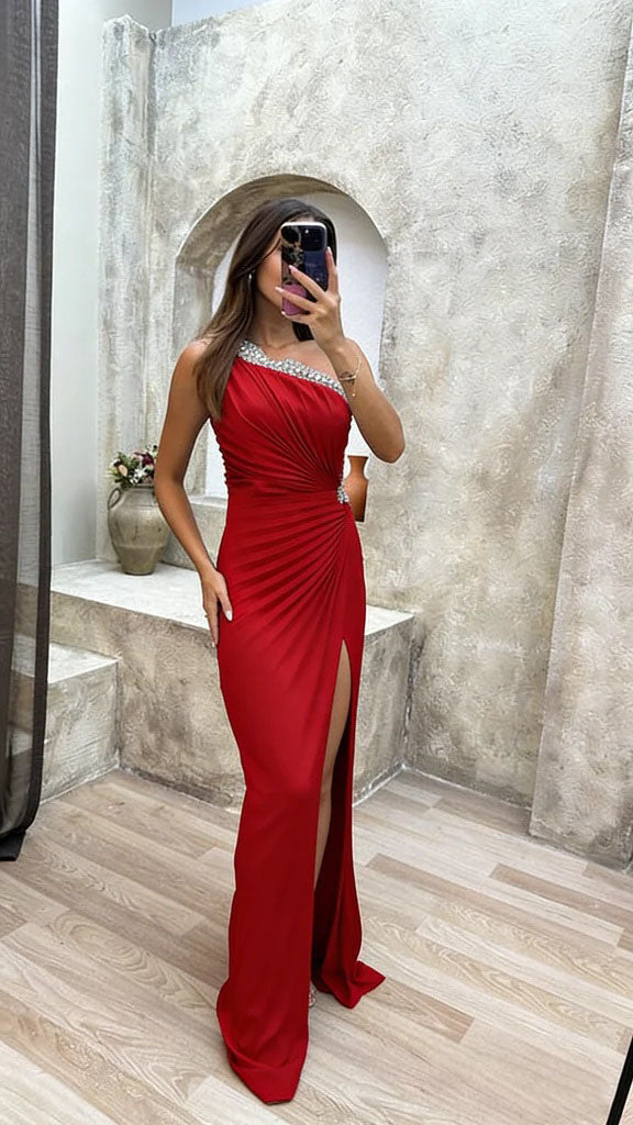 Chic One Shoulder Ruched Satin Prom Dress with Crystal Trim,OLP1815