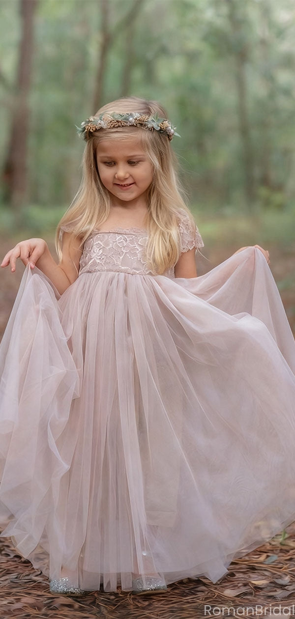 Cute Pink Short Sleeve Floral Long A-Line Flower Girl Dress, FGS0041