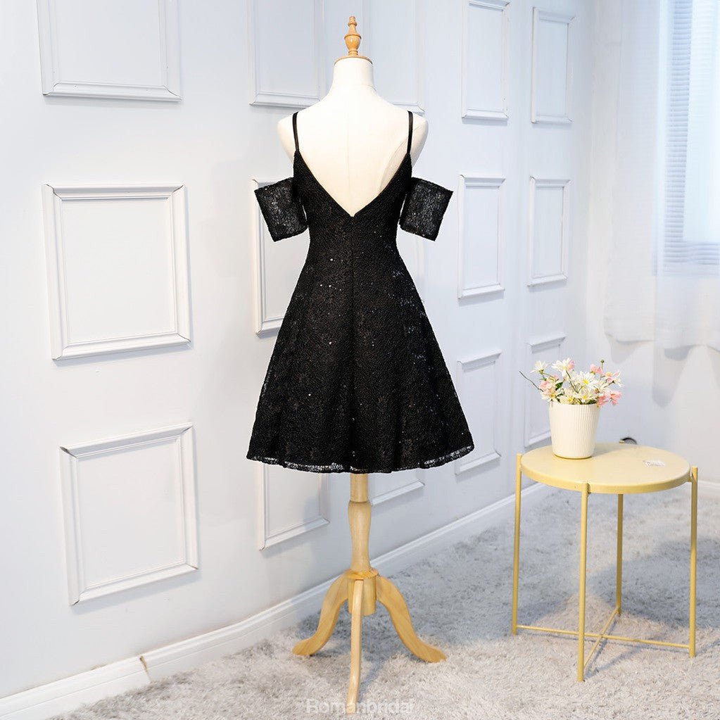A-line Spaghetti Straps V-neck Short sleeves Black Lace Sequins Homecoming Dresses, HD0390