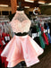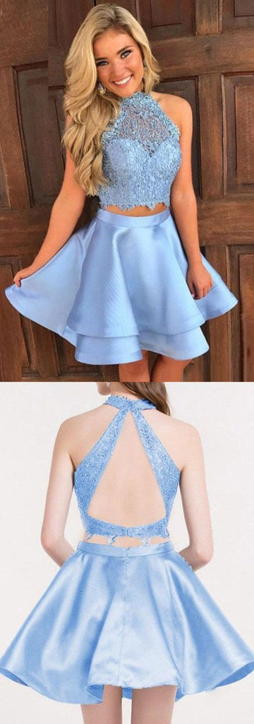 Two Pieces Halter Sleeveless Lace Top Sweet Cheap Short Homecoming Dresses, HD0350