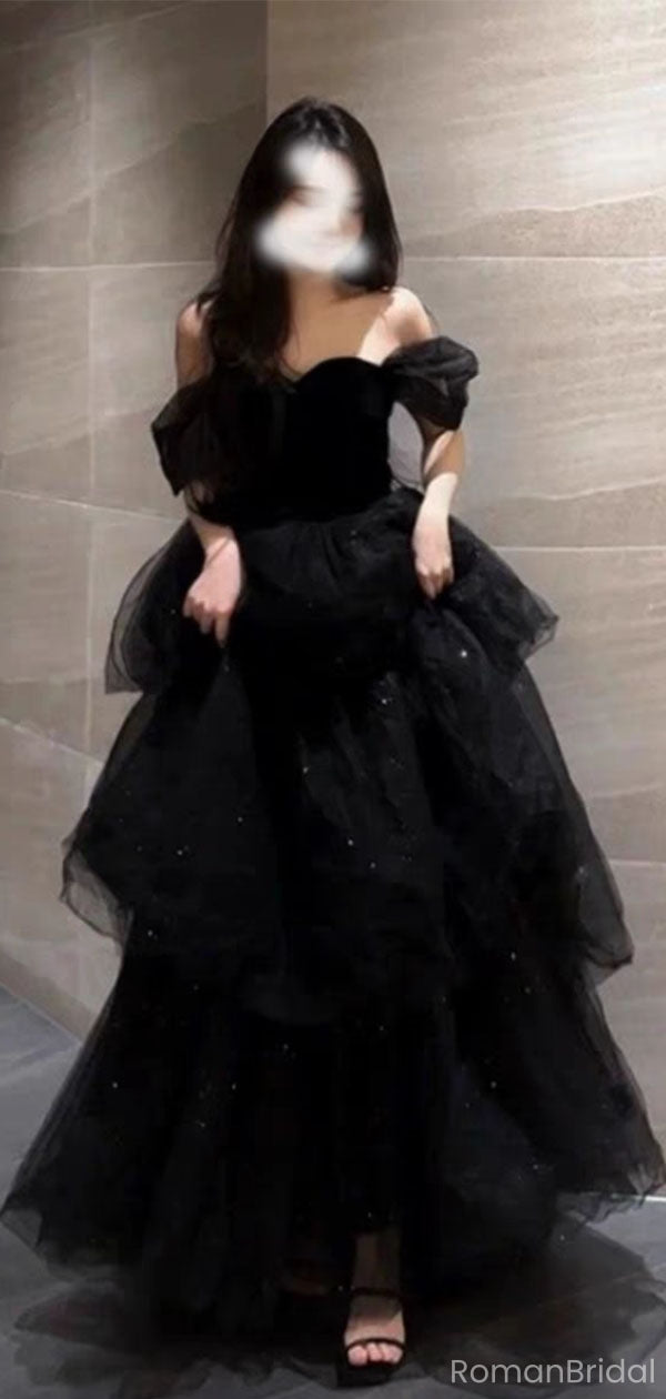 Elegant Black Off-Shoulder A-Line Long Prom Dress Ideas, Evening Party Dresses, OLP1392