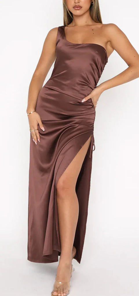 Elegant One Shoulder Mermaid Side Slit Chocolate Satin Long Bridesmaid Dresses Online, BG556