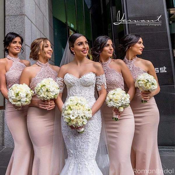 Sexy Pink Halter Sleeveless Lace Mermaid Long Bridesmaid Dresses Online, BG867