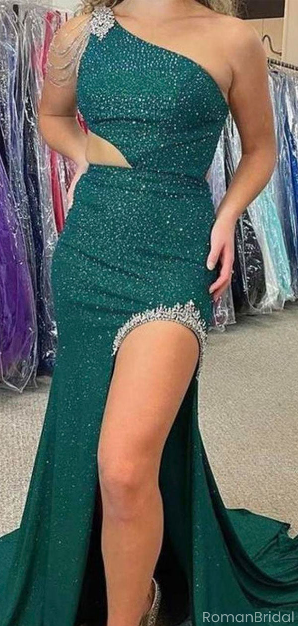 Elegant Green One-Shoulder Mermaid Side Slit Long Prom Dress Ideas, Evening Party Dresses, OLP1383