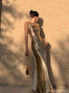 Sexy Gold Spaghetti Strap Mermaid Long Prom Dress Ideas, Evening Party Dresses, OLP1411