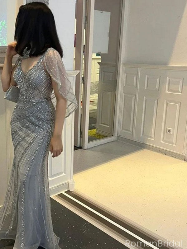 Shiny Blue V-Neck Mermaid Long Prom Dress Ideas, Evening Party Dresses, OLP1349