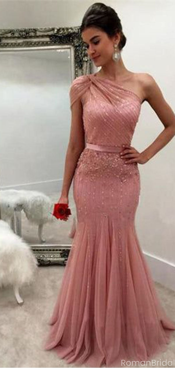 Sparkly Pink One-Shoulder Mermaid Long Prom Dress Ideas, Evening Party Dresses, OLP1416