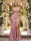 Chic Dusty Pink Satin Side Slit Prom Gown Featuring Sequin Bustier Bodice,OLP1892