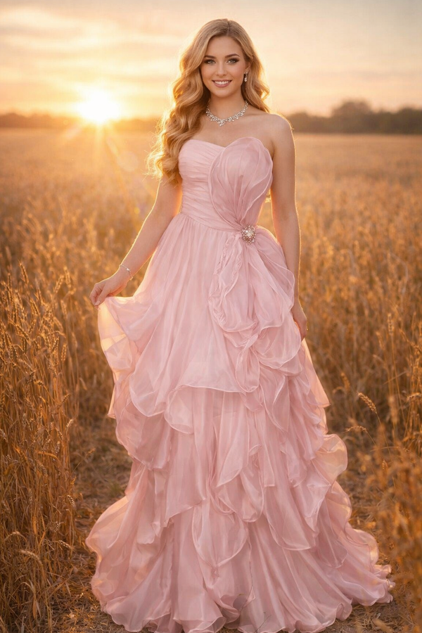Classy Rose Pink Organza Ball Gown Featuring Oversized Floral Shoulder Detail,OLP1898