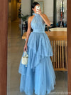 Elegant Blue High Neck Sleeveless A-Line Long Prom Dress Ideas, Evening Party Dresses ,OLP1193