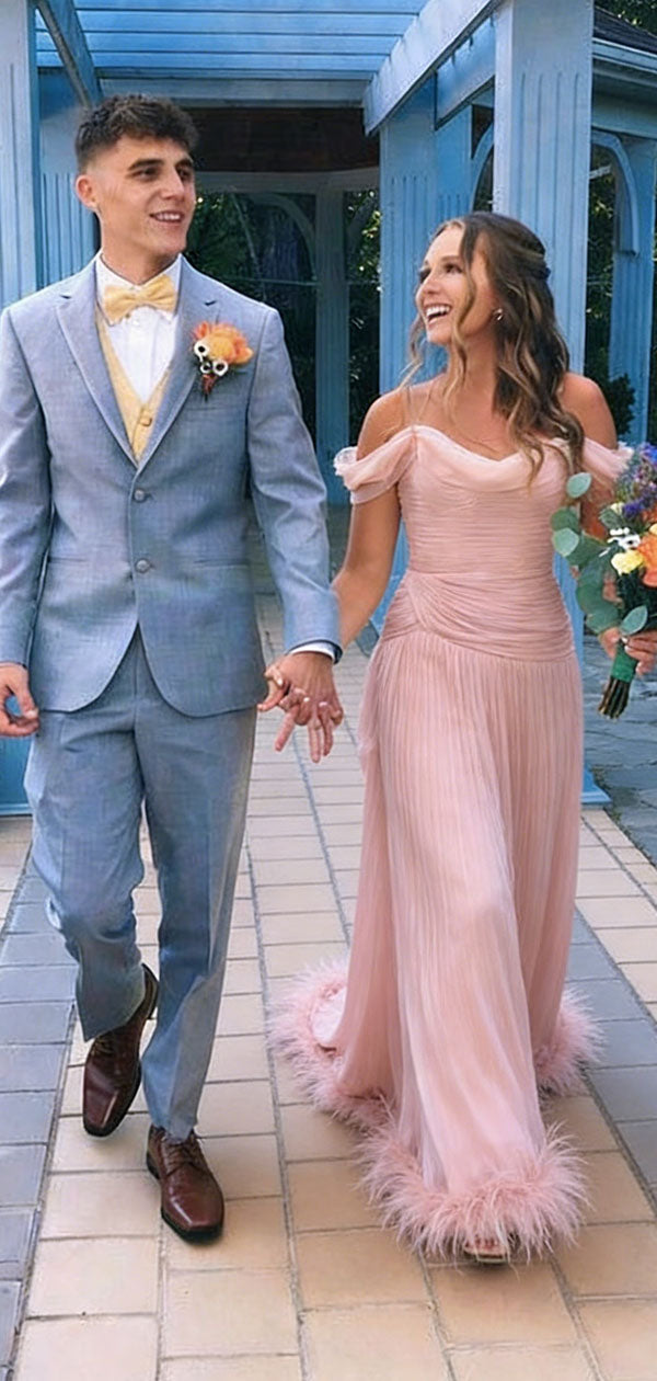 Elegant Off-Shoulder Pink Prom Gown Pleated Chiffon Maxi Dress with Feather Trim,OLP1879