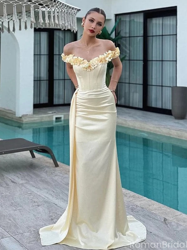 Elegant Yellow Floral Off-Shoulder Mermaid Long Prom Dress Ideas, Evening Party Dresses , OLP1245