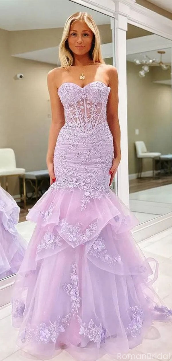 Fancy Lavender Lace Mermaid Prom Gown Strapless Tiered Formal Dress,OLP1788