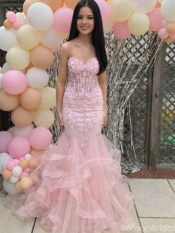 Fancy Pink Sweetheart Corset Prom Dress 3D Floral Ruffle Tiered Mermaid Gown,OLP1842