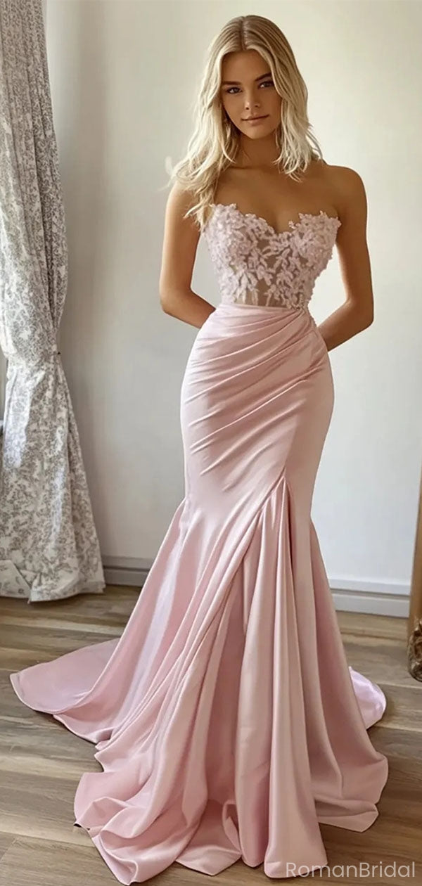 Sexy Blush Pink Satin Mermaid Prom Dress Strapless Ruched Party Gown,OLP1787