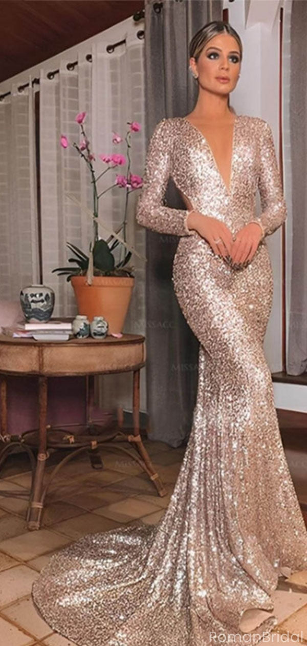 Sparkly Champagne V-Neck Long Sleeve Mermaid Long Prom Dress Ideas, Evening Party Dresses, OLP1617