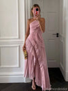Unique Dusty Rose High Neck Pleated Prom Dress Asymmetrical Ruffle Evening Gown,OLP1819