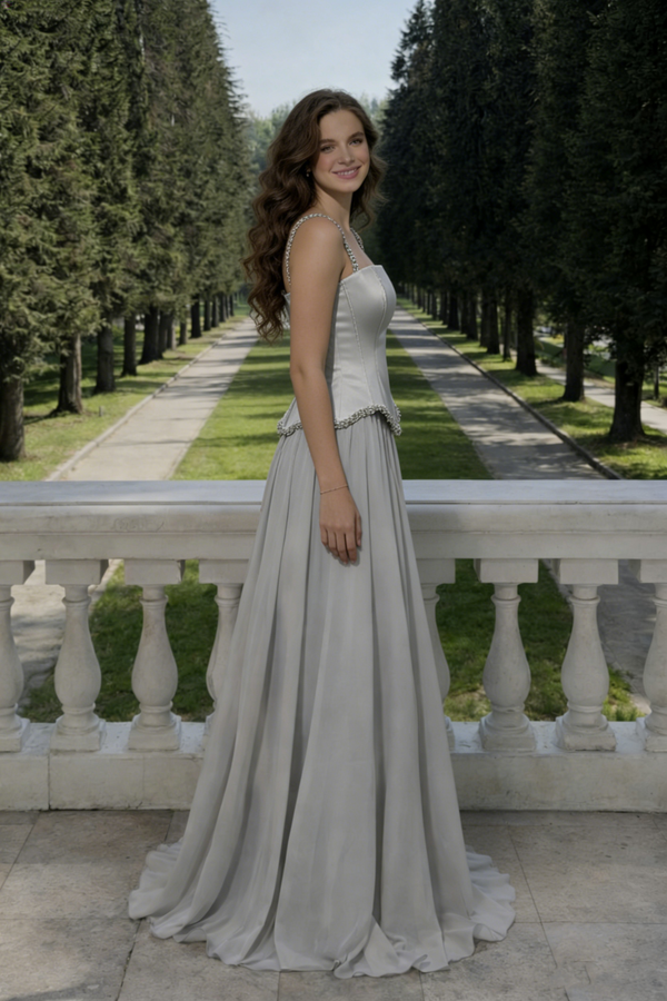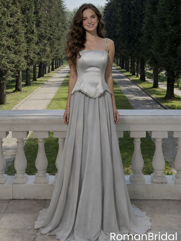 Classy Silver Satin Prom Dress Square Neck Beaded Waist Chiffon Special Event Gown,OLP2013