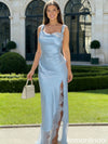 Sexy Ice Blue Satin Prom Dress Cowl Neck Lace Trim High Slit Gown,OLP1947